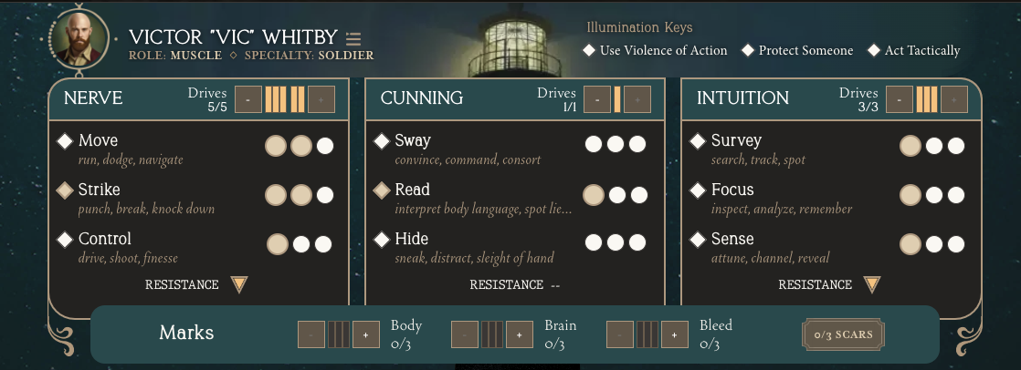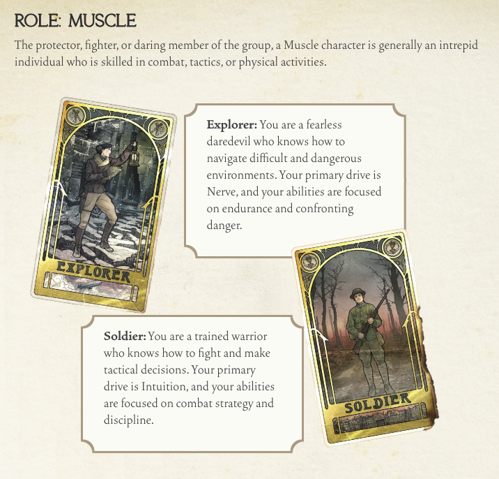 One of the areas that is a bit confusing mechanically here is how drives (ability to add extra dice to a roll) connect to a role’s action. For example, a Muscle Soldier will have the majority of their action points begin in the Nerve category, with two dice for Move, two for Strike (with one special die called gilded), and one for Control. However, the rulebook states that their primary drive is in Intuition, even though the character will not have any action points in that category to start off with (although the player may certainly add action points later in the character creation stage). Mechanically it makes sense why one may want to have more drives in a category where their action points are not powered since that category (i.e. Nerve) will already have built-in a way for the character to potentially earn more drive. However, since this is a game of collaborative storytelling, it doesn’t really provide a rationale as to why the character is initially built this way, and so this could make it challenging to connect the mechanics to the roleplaying in character development.