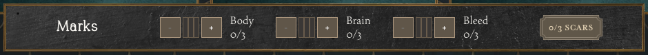 During gameplay, characters can get hurt as they explore the world of Candela Obscura. Whenever they participate in an activity that results in a fail or mixed success result, characters can possibly receive “marks”. These marks can be in the form of a body mark (involving physical harm done to the character), a brain mark (something traumatic that impacts the character mentally), or a bleed mark (as a result of interacting with supernatural phenomena). If a character receives four marks in any category, then they will receive a scar, which represents a permanent change in the character and will result in the player having to move a point from one action to another to show and represent how that character has changed. Where marks are possible to heal between assignments, scars are even harder to heal, if at all. A character can receive three scars in a game.
