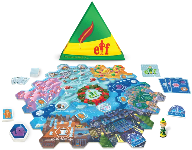 Help Buddy the Elf find his dad in Elf: Journey from the North Pole by laying a loopy route from the North Pole to New York City. Play path cards to the board and move Buddy along its crazy curves. Lead him toward your secret goal landmarks along the way to score points. The player with the most points when Buddy the Elf finds his dad wins!
