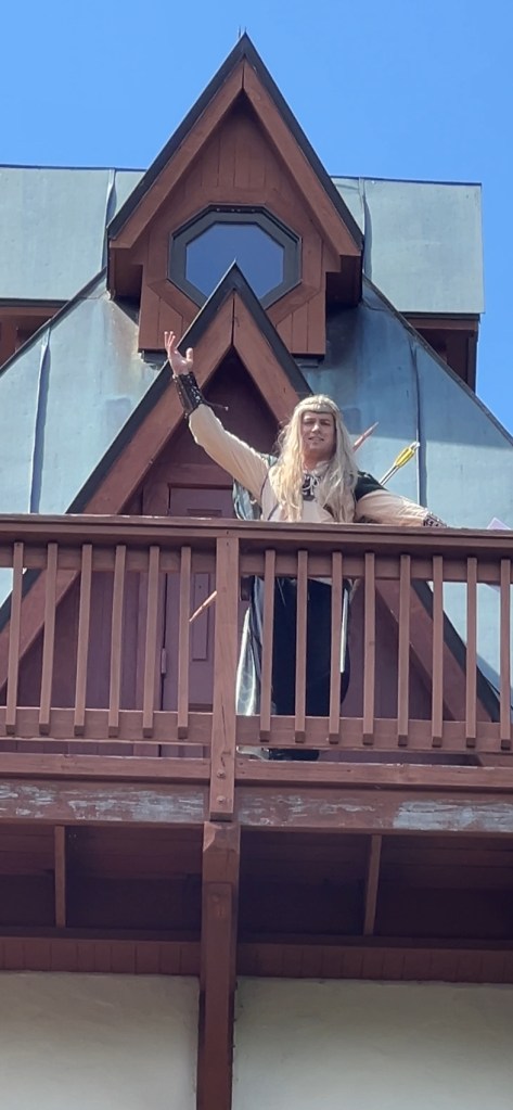 We had an outdoor covered pavilion that was transformed into the Glimmerbrook Tavern filled with tables, a bar, and a snack table for various snack times throughout the day (pretty sure we had Elevenses). It was decorated with various Dungeons & Dragons artwork and statues, as well as tavern accessories such as barrels where you could store your cosplay weapons. The main dining area of the grounds was the “Fey Ballroom” where we would have our meals under decorated banners and stringed lights. This was also where we had our opening dance ceremony (for those who wanted to participate) as well as a table for mini painting and for playing the one-shots that were available during various break times throughout the day. The castle itself is where everyone would play their D&D games, giving it another layer of a fantasy experience during gameplay. They encouraged attendees to cosplay if they desired for the opening banquet as well as any day of the event. But the highlight of this immersion experience was Justin The Charming would become Garethalon Silvershade, a charming, Lord Of The Rings-like elf who would lead archery sessions, announcements, and sing from the top of the castle.