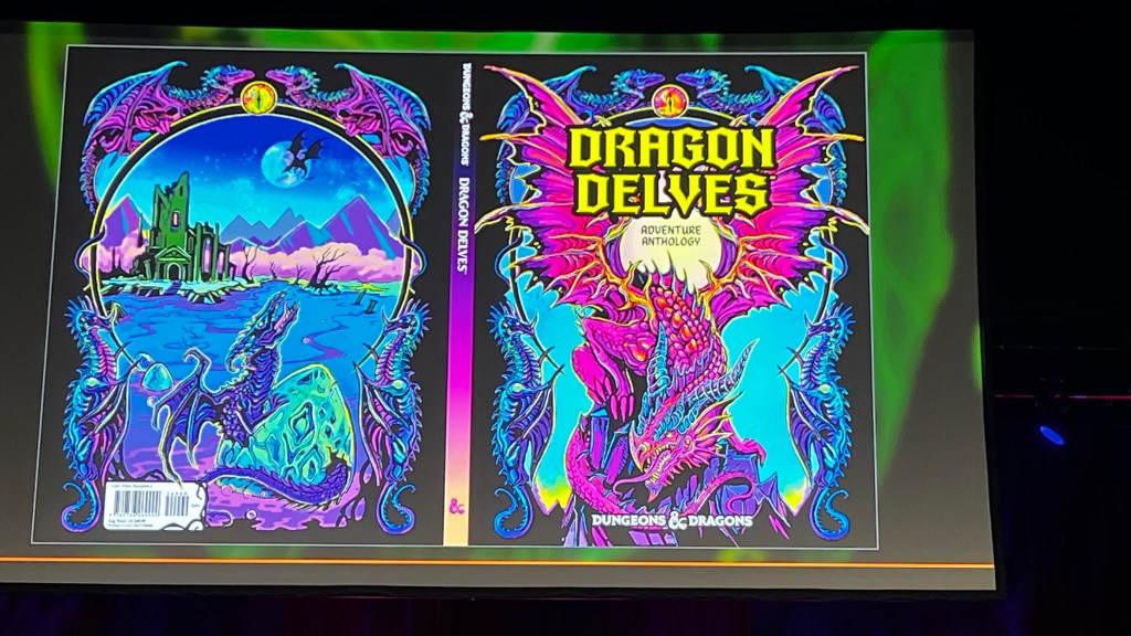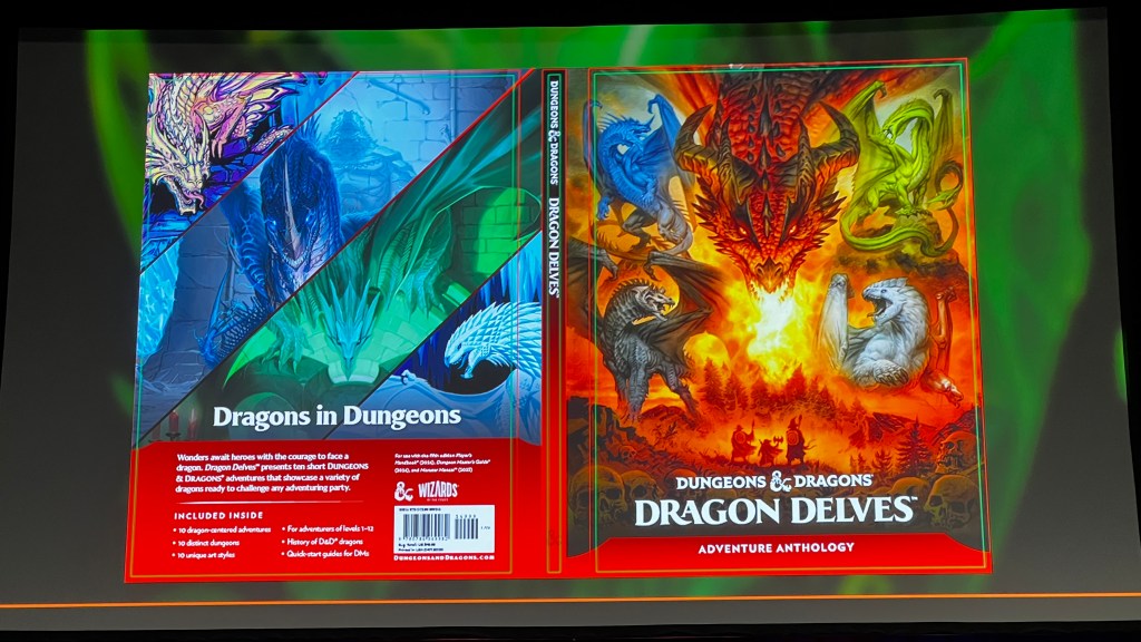 Over the course of the weekend, there were numerous panels that were connected to D&D, such as a few actual plays and a couple of panels. One panel, Here Be Dragons, focused on dragons (shocker!) from both Magic: The Gathering and the newest Monster Manual from Dungeons & Dragons. Jess Lanzillo, the Vice President of Franchise and Product for Dungeons & Dragons, discussed the history and art of dragons in the game as well as their personalities. She also revealed the main and alternate covers for Dragon Delves, an adventure anthology book that will feature 10 dragons and 10 dungeons, set to release on July 8th. The main cover was illustrated by Greg Staples and the alternate cover was illustrated by Justine Jones.