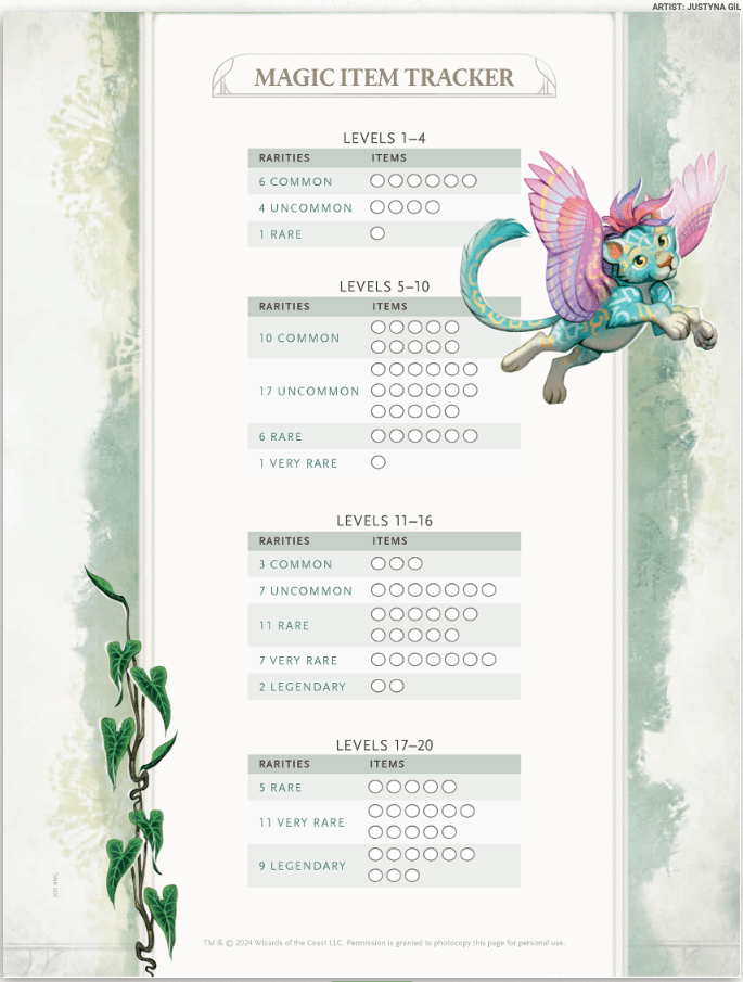 … Each time the characters get a magic item, put a check mark in one of the empty circles corresponding to the item’s rarity and the current level range of the characters. If the characters gain a magic item of a rarity that has no unchecked circles at the current level range, check off an empty circle from a lower tier. If all lower level ranges also have no circles left, check off an empty circle from a higher level range.