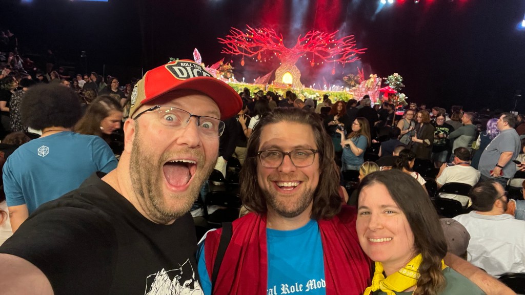 It was a surreal and strange experience for me. To be honest, I felt out of place because I haven’t caught up on any of the lore of the world of Exandria (only what I’ve watched in the animated series), so the people around me knew who a lot of these characters and stories were that I was left a little lost. But a lot of them also didn’t know their new system, Daggerheart, which is what they were playing that night, so I helped fill in the details for some of them regarding the mechanics. (As much as I love Critical Role, the highlight for me was having Chris Perkins and Jeremy Crawford there, playing adversaries during their show. I loved them at D&D and so it’s nice to see them back together again.)