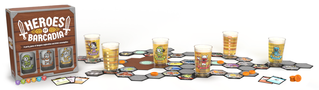 One of the appeals of Dungeons & Dragons for many people is crawling dungeons to fight monsters and find treasure. What if there’s a game that offered this experience using a “liquid life system” that allowed you to track your hit points by drinking your favorite beverage? Then you will want to check out Heroes Of Barcadia from Rollacrit. Taking on a character with a funny drinking pun (e.g. Keggar The Barbeerian), you and your friends start at the dungeon portal where you explore the dungeon by moving to an unexplored room. There, you’ll turn the tile over to possibly find treasure, traps, or a monster to defeat. To defeat a monster, you roll a d20 against the monster’s DC. If you succeed, you win any rewards with that room; but lose and you’ll lose hit points, which is shown by you taking a drink from the character cup you’ve selected. The goal is to eventually find the location of the Drink Hoard and defeat the Grand Drink Guardian. Suited for 2-6 players (expansion packs can increase this number of players), and is suited for most ages (the age listed is 21+ for drinking puns. This is designed to be a kind of drinking game but drinking alcohol is not a requirement to play). A game of Heroes Of Barcadia can last anywhere from 30-90 minutes.